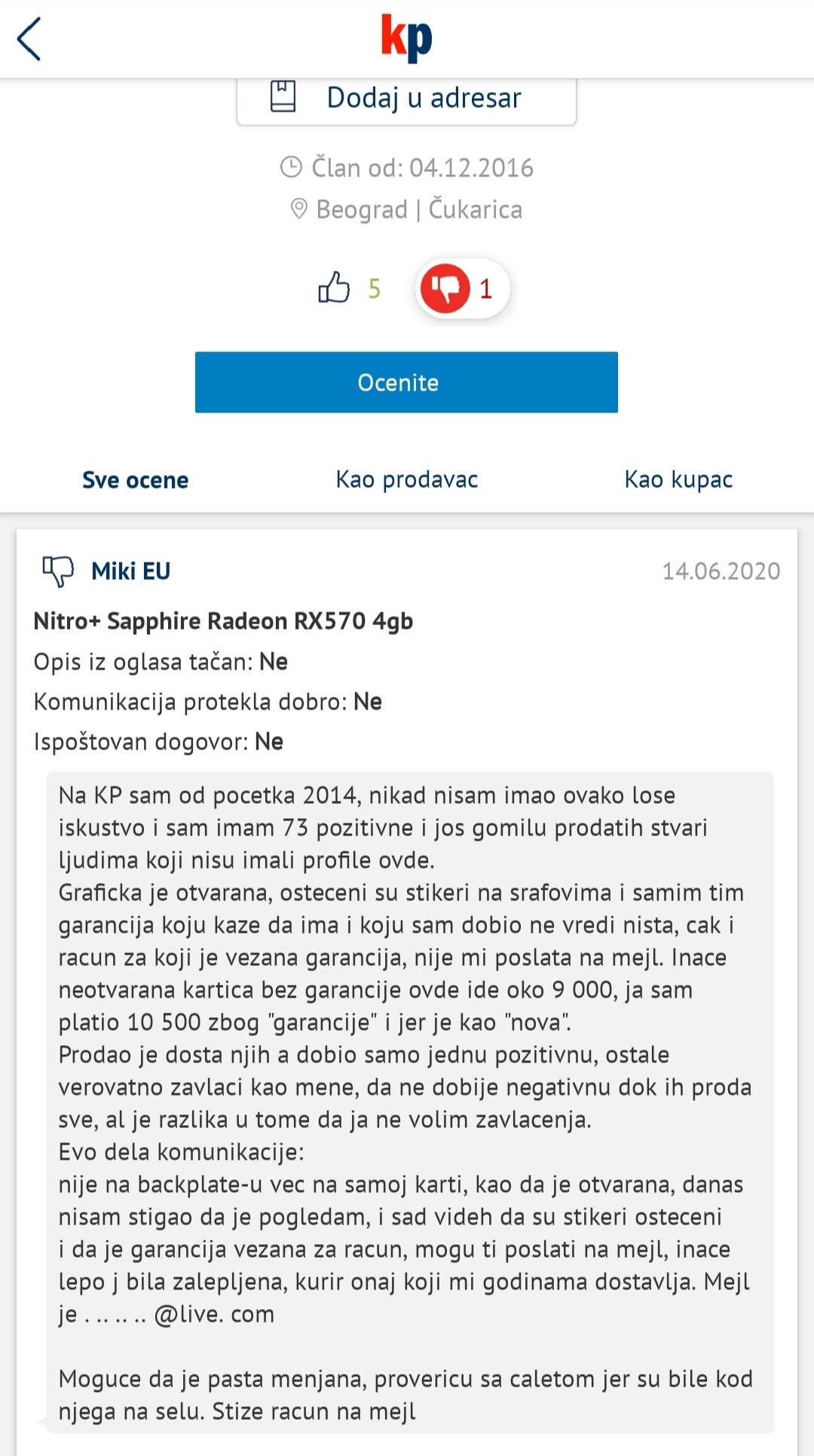 Dobio je karticu za koju je platio,dobio je ispravnu karticu,kartica ima domacu garanciju. Nista nije slagao. Jedino je precutao da je menjao pastu,sto dalje navodi da garancija vise ne vazi,ali je fizicki ima... Svakako bi dobio negativnu ocenu na kraju,ali ako mislis da izvuces svoj novac nazad to moras da uradis pametno.Brate jesi realan? Kakva laka prevara? Kakav ako prodje prodje. Ovakav clan ne da treba da ima negativne nego treba da bude uklonjen sa KP sajta da ne bi dalje varao ljude. Sad cemo da delimo po klasama kp prevarante?